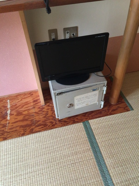 金庫。その上にテレビ・・・。安物なのか、HDMIケーブル接続できないわ。